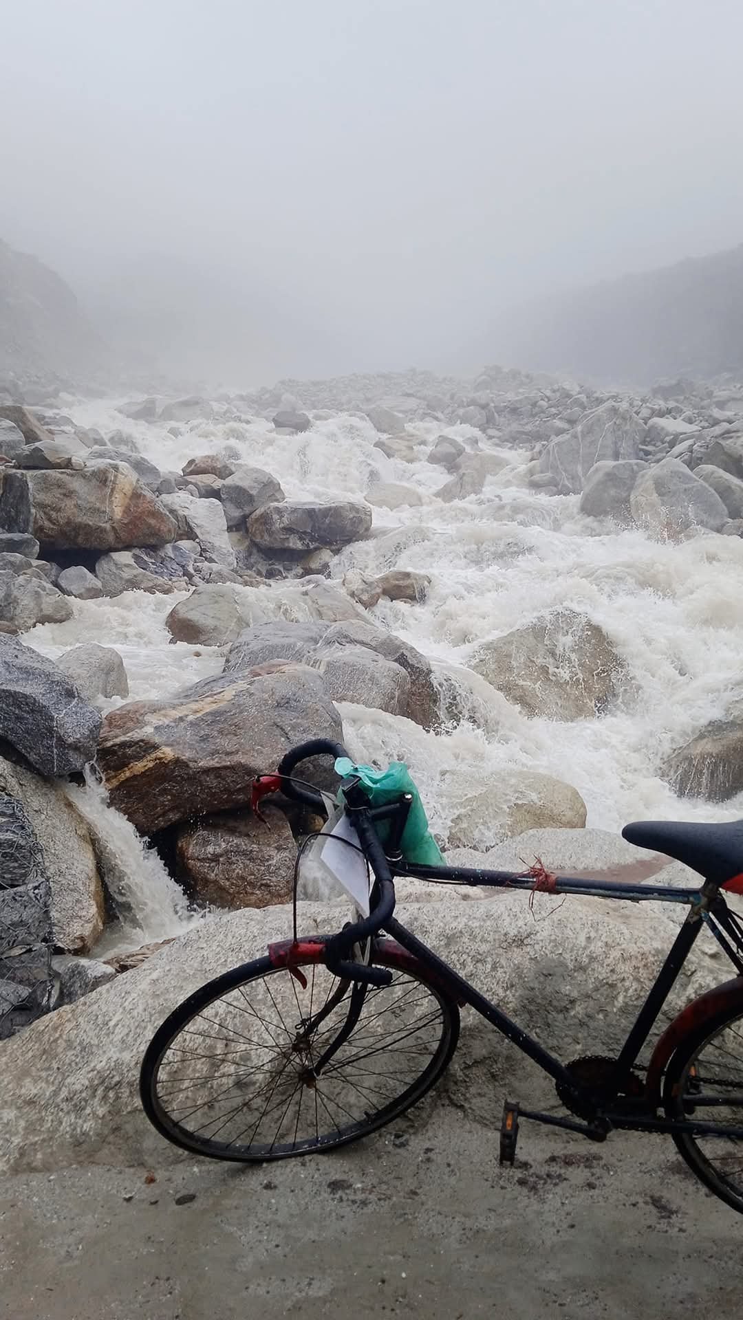 Beyond Ghumti Bazaar, the rains arrived — fierce, relentless mountain rains unlike anything I had ever encountered before. Streams of water clogged my wheels, the roads crumbled beneath me, and the shadow of death seemed to hover uncomfortably close. Yet I refused to stop.